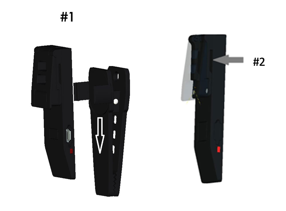 - Clip QX1 into the shirt pocket fabric between the main body and shirt pocket clamping slot (#2)